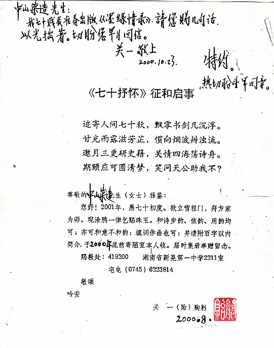 交流の手始めは歩韵から着手し、止めるまで歩韵は続く。著者の下には毎日のように寄稿作品が郵送されてくる。作品には殆ど歩韵を為して返信する。作品は便箋にその場で書いたので、控えを残した記憶は余りない。